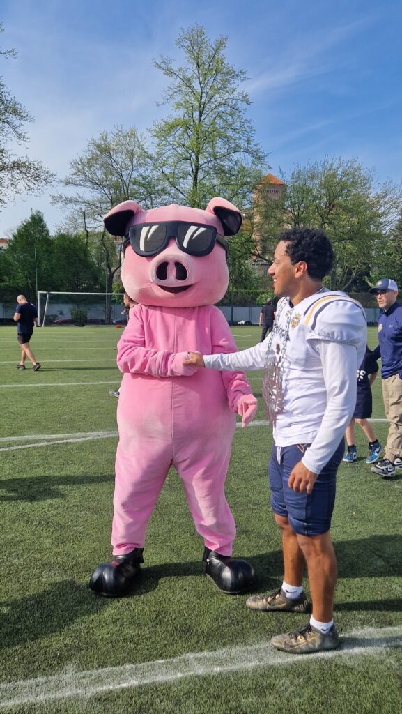 Już podczas meczu 13 kwietnia 2024 roku miała miejsce jedna z pierwszych wspólnych inicjatyw, kiedy to nasza Szalona Świnka – towarzyszyła i kibicowała drużynie Kingsów podczas meczu z Jaguars Kąty Wrocławskie, który miał miejsce tu, w Krakowie. To był niezwykle ekscytujący mecz, który zakończył się zwycięstwem Kings Kraków. Aby uczcić naszego najlepszego zawodnika, Szalona Świnka osobiście wręczyła mu voucher na wyjątkowy posiłek w naszej restauracji.