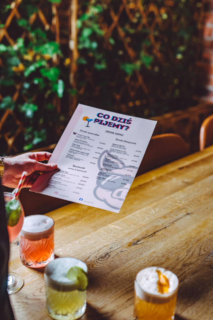 Dla spragnionych nie zabraknie napojów przygotowywanych przez naszych barmanów z bardzo szerokiego asortymentu. Koniecznie spróbuj też naszych autorskich drinków takich jak Sweet Crazy Pig lub Apple Paradise lub wybierz klasyczny koktajl aby urozmaicić swoje danie.